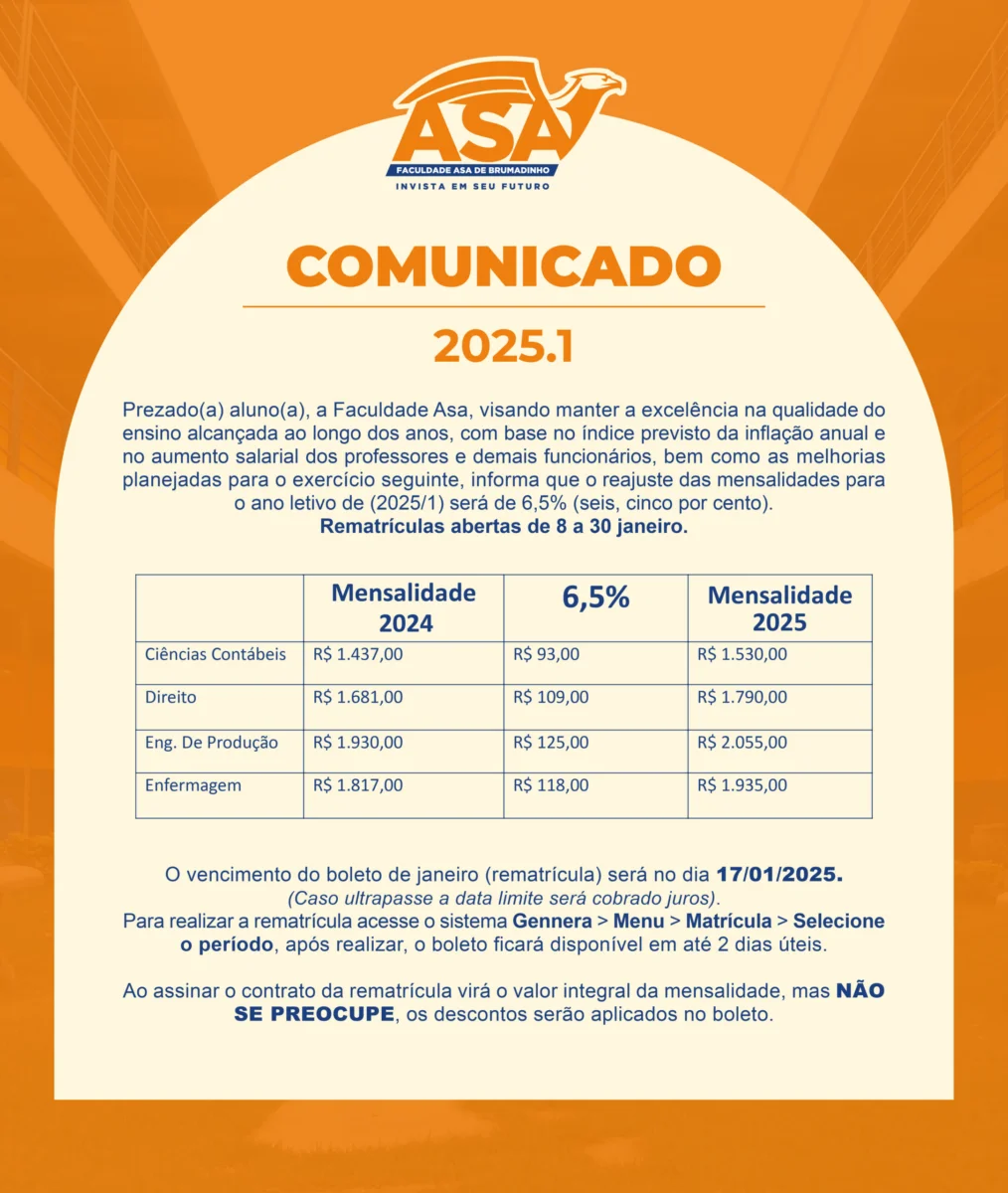 COMUNICADO: REAJUSTE 2025 – GRADUAÇÃO