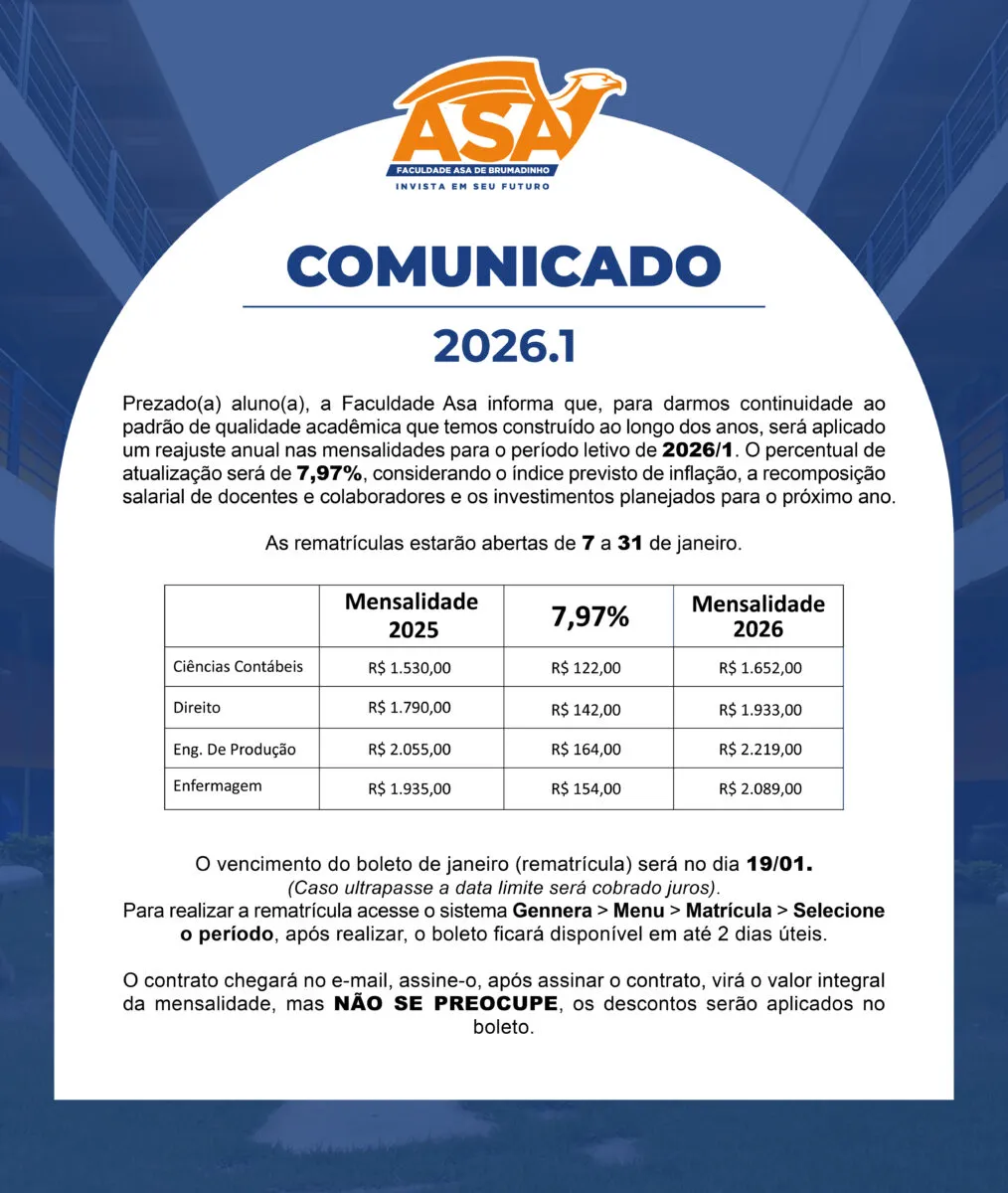 COMUNICADO: REAJUSTE 2026 – GRADUAÇÃO
